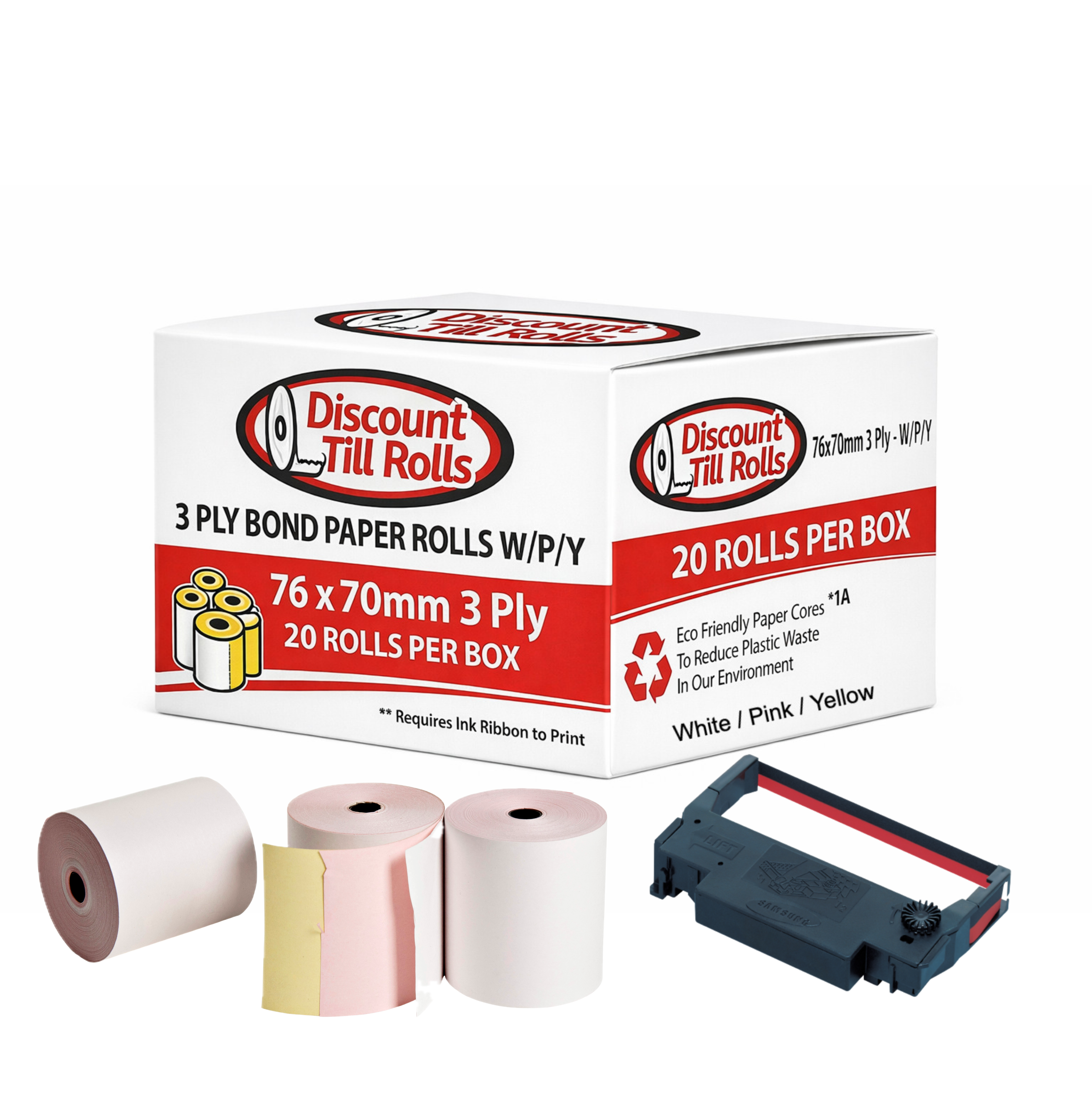 76x70mm 3 Ply Till Rolls (White/Pink/Yellow) (20 Roll Box) AD3767612 with Free Ireland Delivery.
