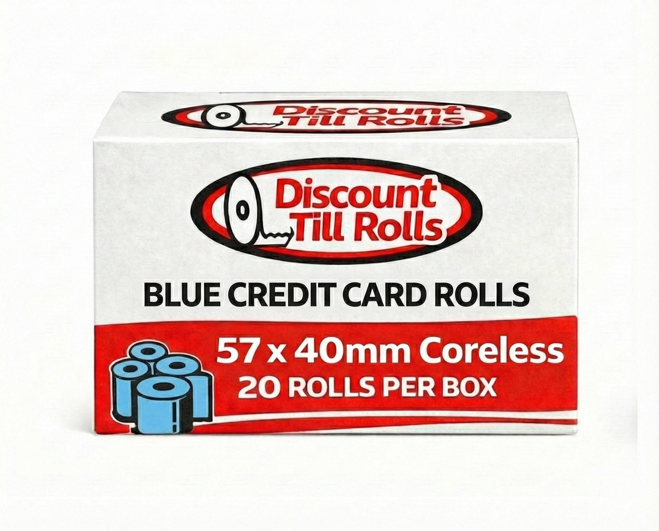 Premium 57x40mm Blue Coreless Credit Card Rolls (20 Roll Box)