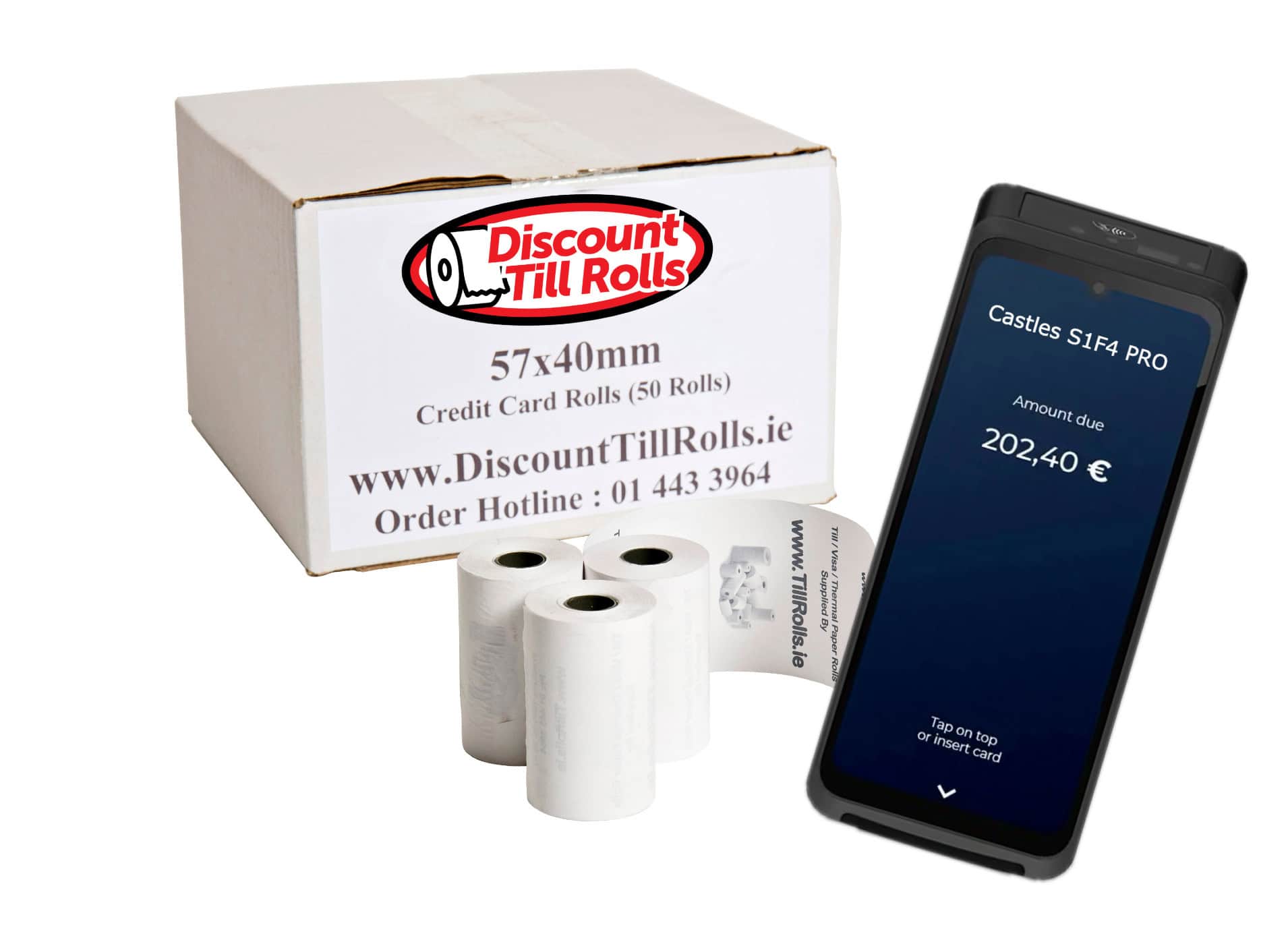 The Castles S1F4 PRO uses 57x40mm thermal receipt rolls. This is the standard credit card machine size used across most modern terminals in Ireland.