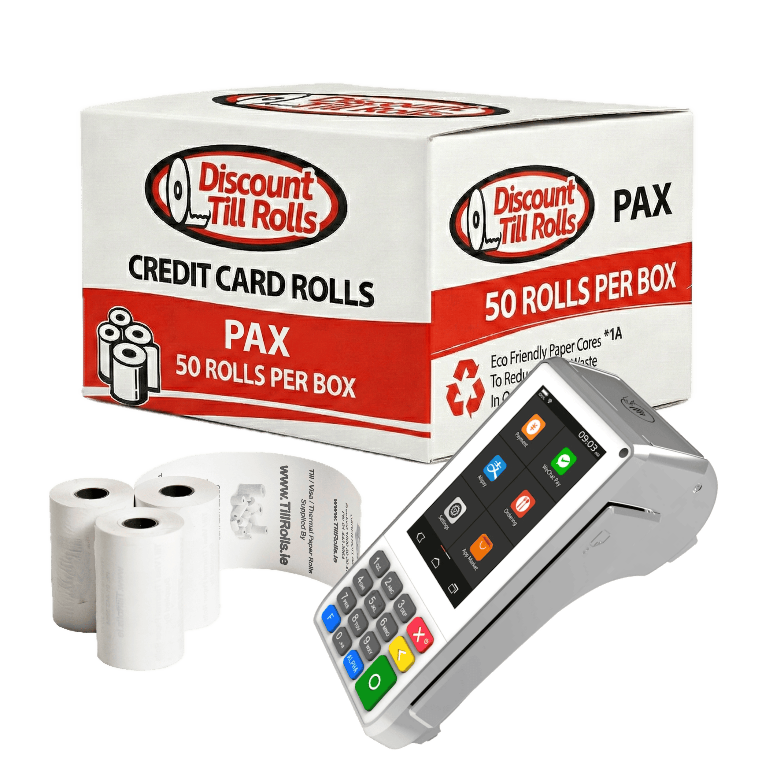 Discount Till Rolls only use "Epson / NCR / IBM / AXIOHM Approved Paper" to make our PAX A80 Receipt Rolls. By using only OEM approved credit card rolls you will protect the print heads on your printer from damage. Replacing print heads on your credit card terminal can be nearly as expensive as buying a new machine. Cheaper credit card rolls will wear out the print heads faster and will leave dust to clog up your printer and damage your print heads and printer sensors. Also the printed receipts can fade in a short period of time, that you can no longer read it. In these cases cheaper is not always better the only answer is, Low Cost High Quality PAX A80 Credit Card Rolls from Discount Till Rolls, look for branding TillRolls.ie on back of roll to be sure of high quality paper.