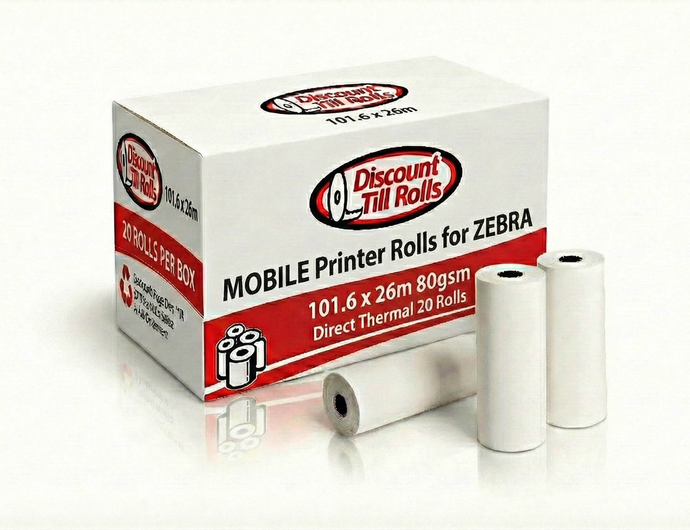 ZEBRA ZQ630 80GSM BPA Free Thermal Receipt Rolls (20 Roll Box) with Free Ireland Delivery. 101.6mm x 54mm (26m) Cont. x 19.8mm Core
