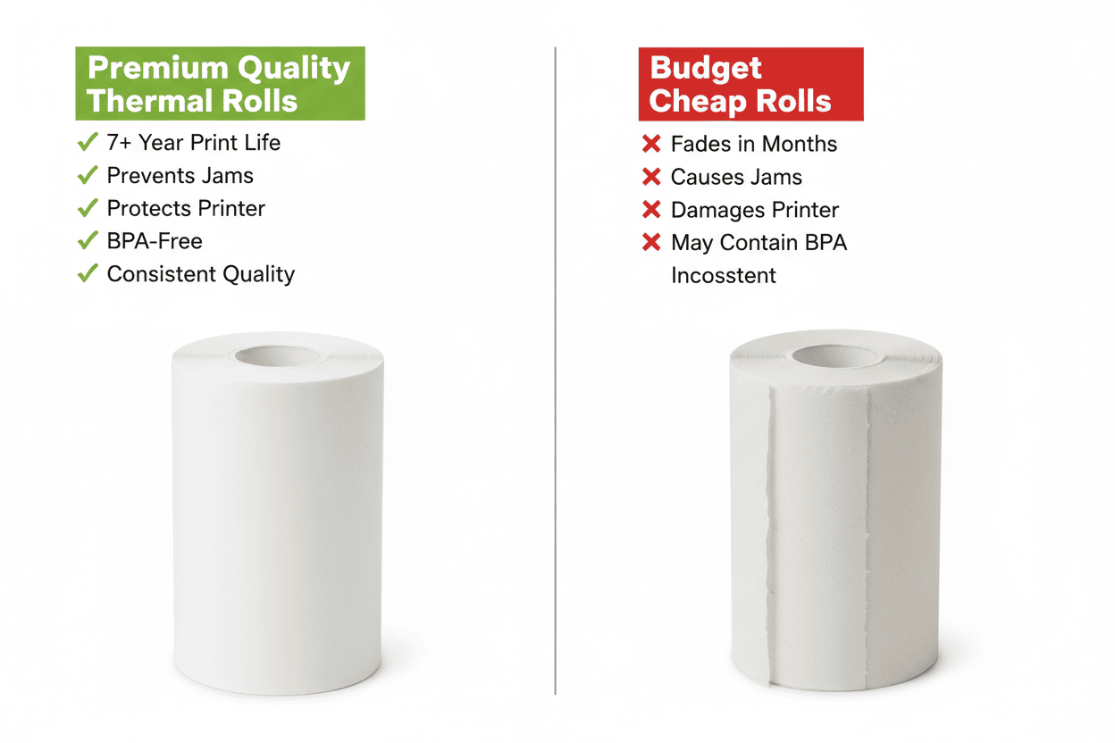 - Bulk 20-roll box: Typically 1-2 months supply (10,600+ receipts per box)