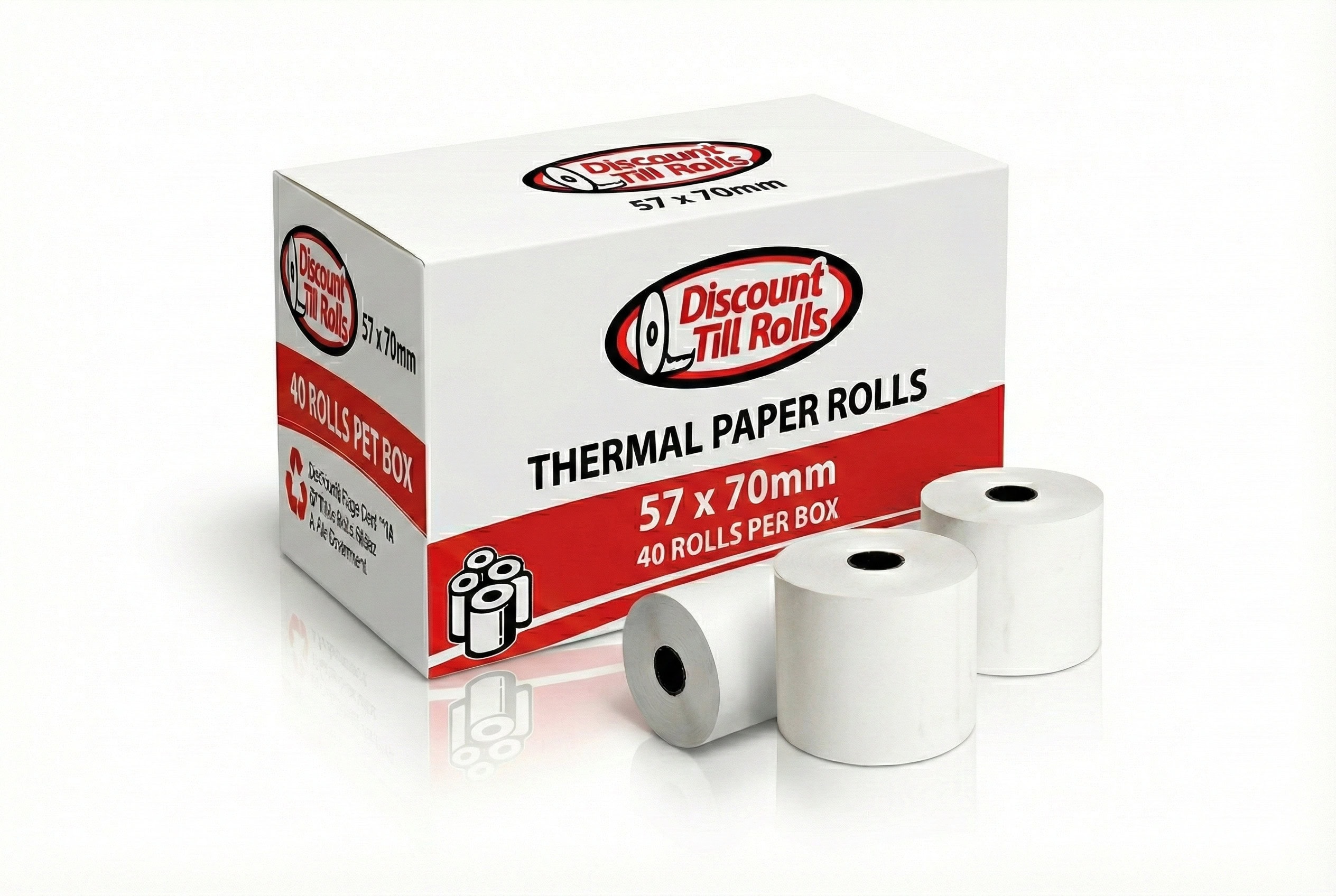 Size: 57mm x 70mm Quantity: 40 rolls per box Type: High-quality thermal paper Compatibility: Most standard cash registers and printers Shipping: Free Next Day Delivery in Ireland Core Size: 12mm Paper Weight: 58gsm